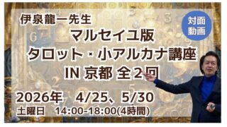タロット 伊泉龍一先生による『マルセイユ版タロット・小アルカナ講座(全2回)IN京都』 4月から始まる伊泉龍一先生による『マルセイユ版タロット・小アルカナ講座(全2回)IN京都』のご案内受講生様募集中!伊泉龍... 2026.01.01 タロット占い